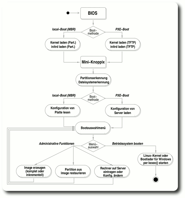 Vom Bootlader (grub lokal von Platte, oder Netzwerk PXE/TFTP-Server) werden Kernel und initiales Ram-Dateisystem geladen und gestartet. Nach normalerweise recht kurzer Startzeit wird eine graphische Oberfläche mit Auswahlmöglichkeit präsentiert, während parallel dazu die Hardwareerkennung von Netzwerkkarten und Festplatten läuft. Nach Auswahl eines Buttons werden verschiedene Aktionen über ein Worker-Backend-Skript abgewickelt. Das System ist Open Source und leicht erweiterbar.
